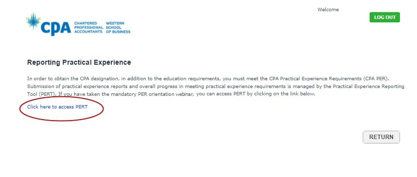To access the Practical Experience Reporting Tool (PERT), proceed to the My CPA portal .