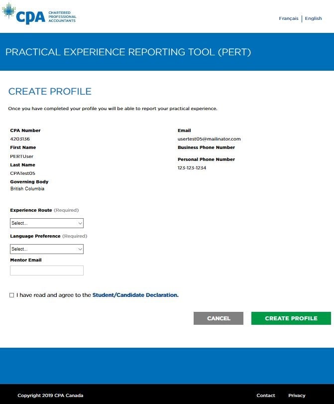 Once in PERT, you will need to complete the ‘Create Profile’ section as not all the information for your PERT profile flows from your My CPA profile.