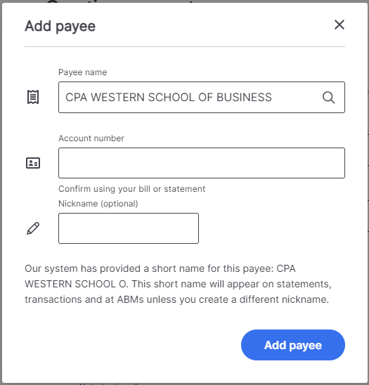 3. Select “Add Payee” and search for CPA Western School of Business.