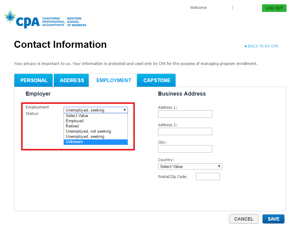 Step 3: Click on the 'Employment tab' and choose your employment status in the drop down menu under Employer and fill in the business address (if applicable).