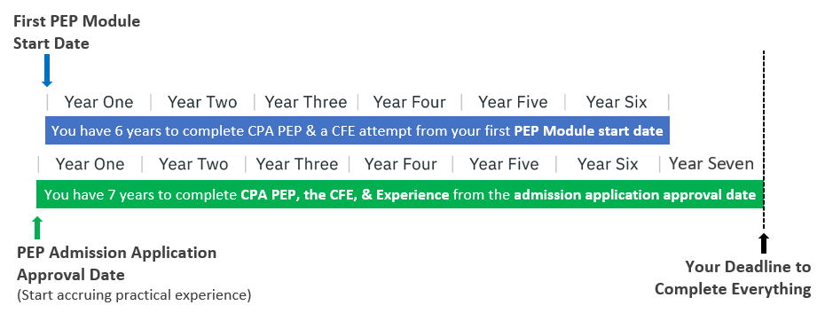 If you start CPA PEP to start accruing experience and don’t start the PEP modules within one year of your admission application approval date, you will not have the full 6 years to complete CPA PEP and the CFE. Any applicant who registers in the program to start accruing experience but does not plan to begin taking PEP modules right away needs to consider this.