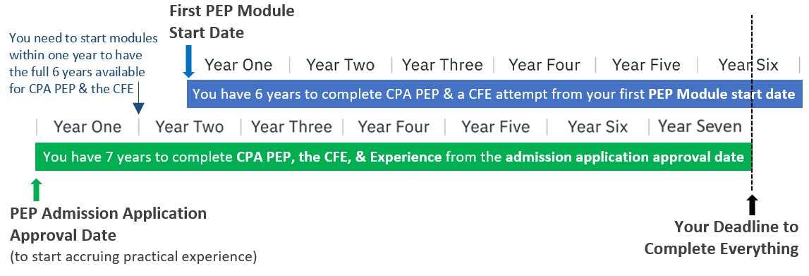 While the duration to complete CPA PEP and the CFE is typically about 2 to 2½ years, CPA candidates have up to six years to complete all the CPA PEP modules and attempt the CFE at least once, measured from the start date of the first module taken. The maximum duration for completing the entire CPA certification program (CPA PEP, the CFE, and Experience) must not exceed seven years measured from your PEP Admission Application approval date.