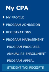 All tax receipts can be found on your MY CPA portal under Program Management/Student Tax Receipts. This will include all previous tax receipts that have been issued to you.